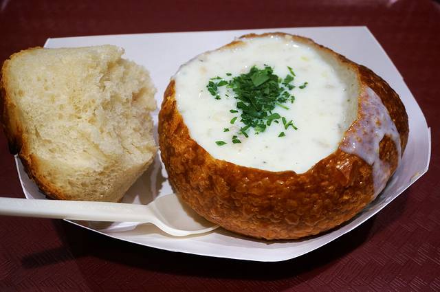 波丁酸面包工厂就在渔人码头标志牌旁不远,最著名的菜品就是酸面包当容器的海鲜汤,现场制作,堂食的时候可以看到盛着大圆面包的篮子从作坊里沿着轨道源源不断的送到厨房,味道也确实不错,很值得一去。一楼面包店外设有露天座位,可惜我们去的时候下雨,哭……