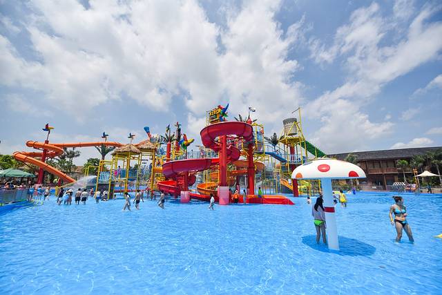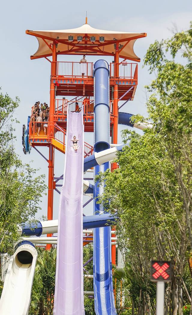 我们就近原则,先去了水上梦工厂,这里有众多盘旋而上的阶梯和许多其他玩水设备,印象最深的就是从天而降的大水花,一下子淋在我们身上,我有点懵逼,难道这是方特给的见面礼?这也太——爽啦!夏天这么来一场够够的!