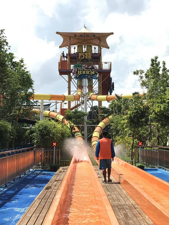 说说我印象比较深的几个项目吧。第一个是比翼双飞~名字很欺负单身狗了。工作人员让我们进到一个透明仓,脚踩着挡板,这时候我几乎是垂直站立的。关上玻璃门后,我有点腿抖了,这是什么操作?要上天了吗。。。然后在他戏谑的眼神中(我这么觉得),板子撤离了,整个人就往下掉了!!!黑乎乎的将近垂直的遂道,我就掉下去了!!不过也就一两秒的时间,等我滑出来的时候,心砰砰砰直跳,另一条通道的小伙伴,弱弱的说:知道为什么叫比翼双飞了。。会想抱着你哭啊!现在想起来还心有余悸,但是很好玩,如果你有男朋友或者女朋友,这个项目怎么可以错过!