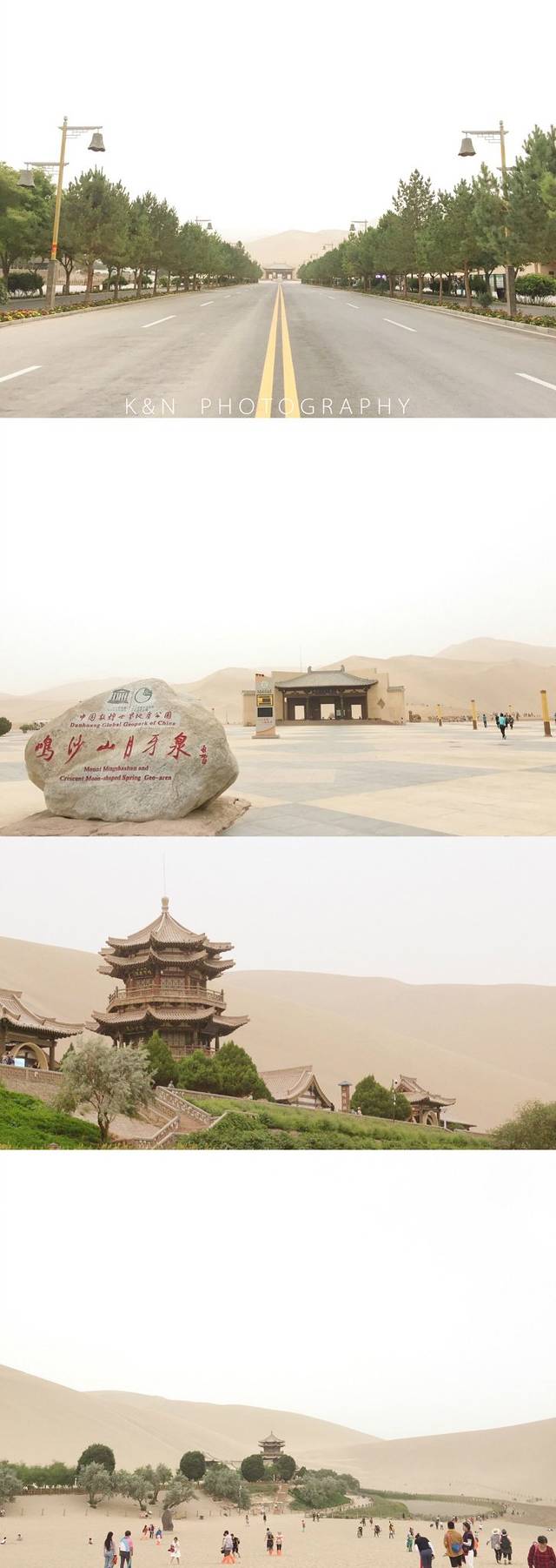 回到客栈附近已经是下午4点多,我们所在的客栈离鸣沙山很近。公路的尽头就是无边无际的鸣沙山沙漠。如果怕沙子进鞋,这里可以用到茶卡盐湖那时买的一次性水鞋啦!(这就是我之前为啥让你们别扔掉(笑cry))不过鸣沙山也有防沙鞋和相机防沙套租的。