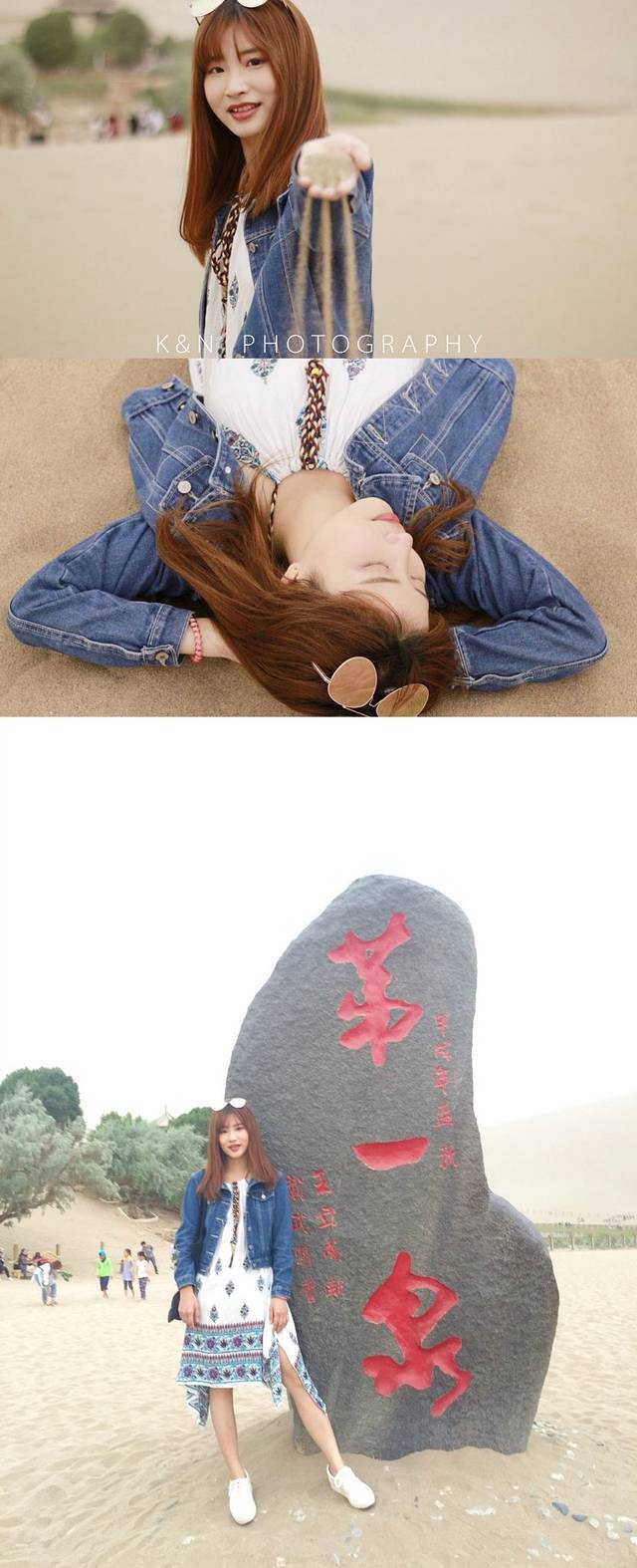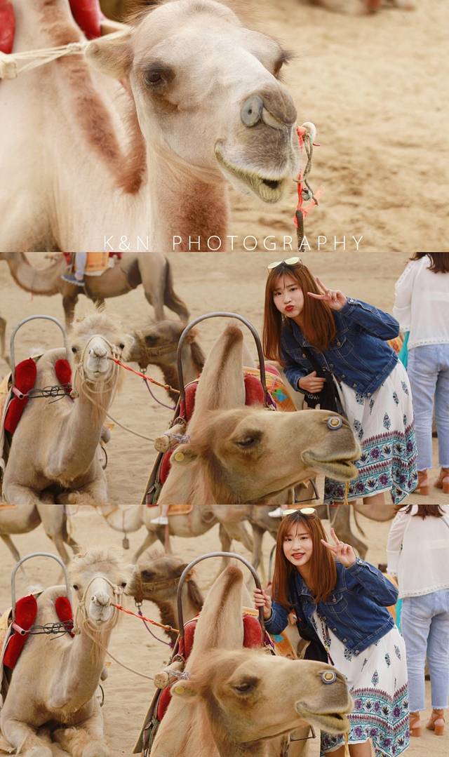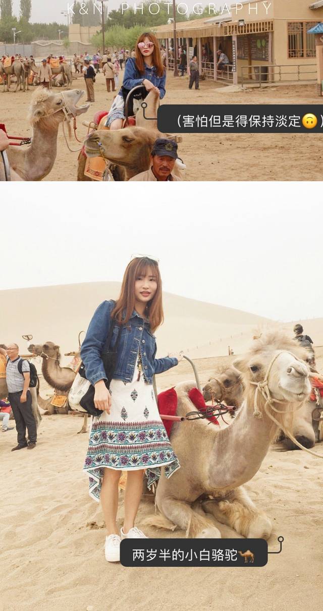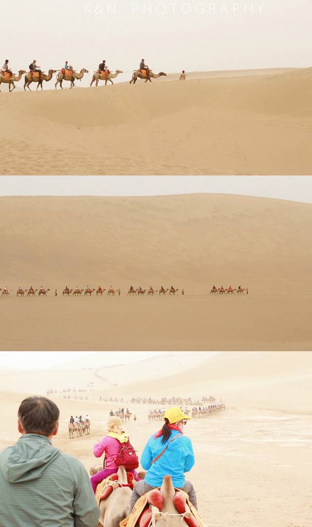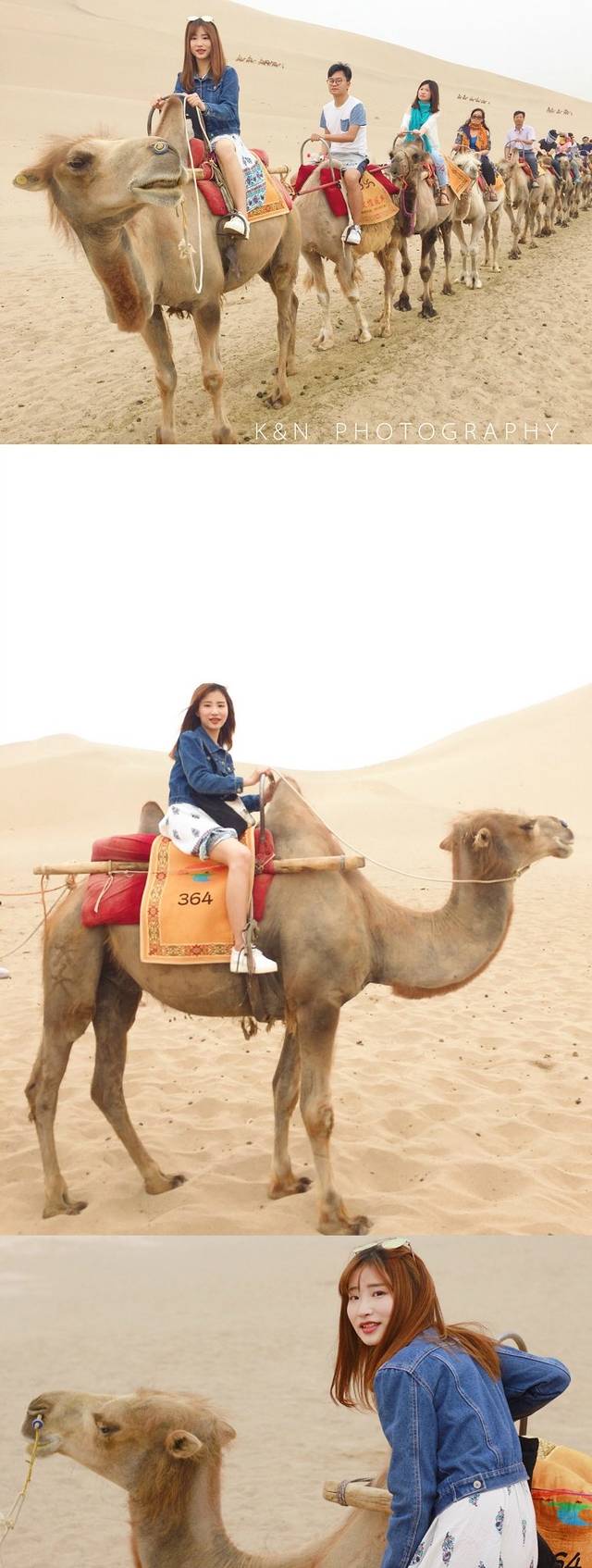 进了鸣沙山景区后,第一时间我们先去了骑骆驼。第一次骑骆驼颠得屁股和腰都疼,骑我后面的一只两岁半小白骆驼一直粘着我,我又想起了《鬼吹灯之精绝古城》里安力满大叔的沙漠救命白骆驼。还没善于驼人的他一直喘气(其实小白骆驼原本是我的坐骑,不过后面的一家子想连着一起坐所以割爱小白骆驼让给他们因为每匹骆驼都要按编号排),最后和小白骆驼合照很配合看镜头微笑哈哈哈。