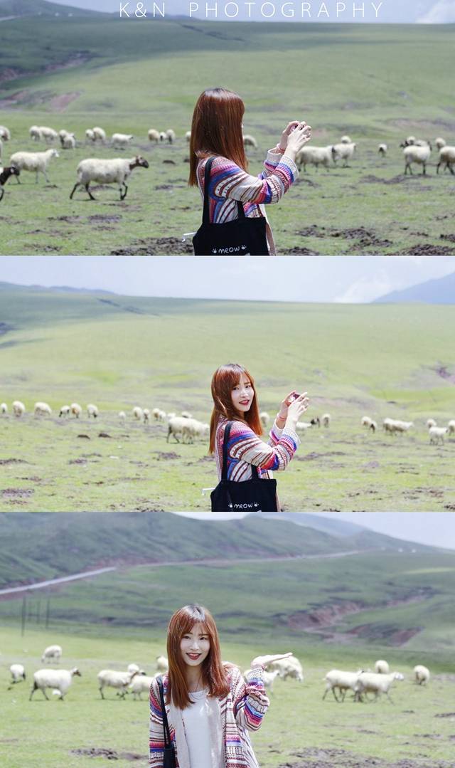 在垃脊山的路上,从阴天冰雹到晴天一路见四季,司机小马哥停在了一片人烟稀少的草原上让我们拍照看远方的积雪还未融化的雪山。一下车,没见过羊群的南方人如我哈哈哈哈~