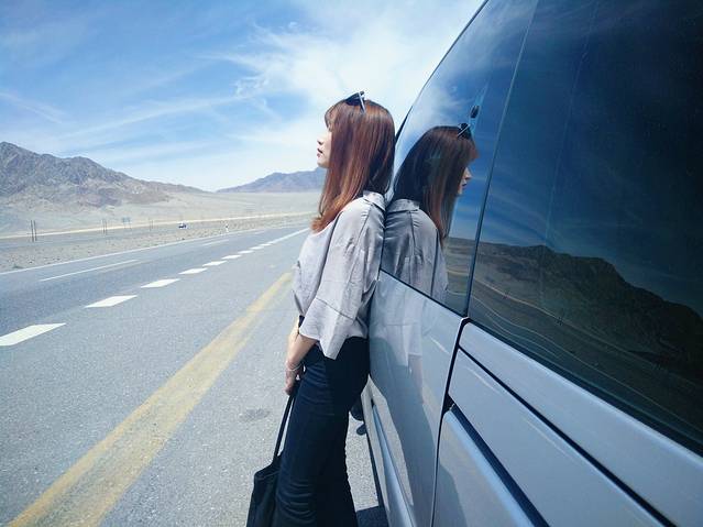 看完日出,收拾好行李,就出发去最最期待的茶卡盐湖啦!出发的时候依旧得长袖长裤穿棉袄,因为昼夜温差不是一般的大,太冷了。把拍摄的裙子带在书包里面,等天回暖了到的目的地再换,然后又在车上成功撸了一个粉嫩嫩的心机妆。