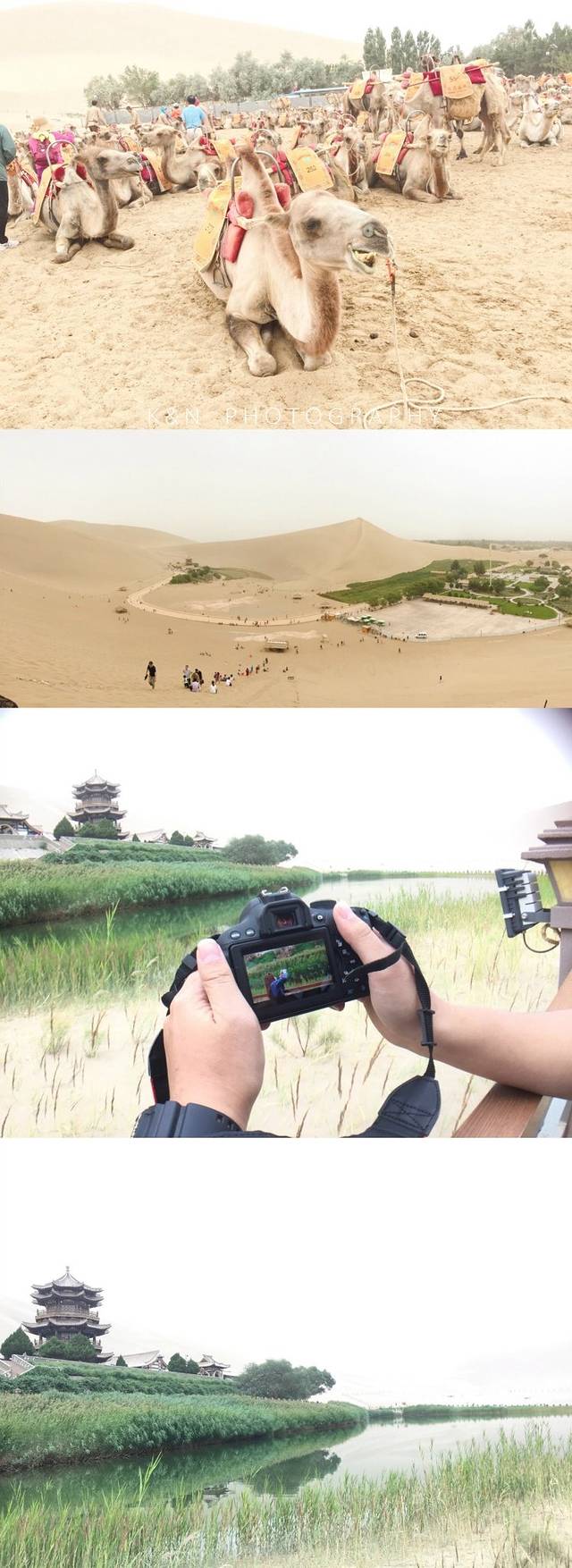 骑完骆驼我们就去月牙泉溜达溜达。沙漠之处,最神奇的就是唯独月牙泉周围的地都是湿湿的。