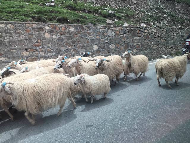 吃完小吃继续上路。一路上,羊群围绕着车在公路上走超可爱!