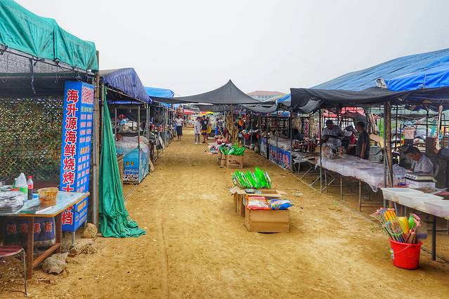 过了山海天三浴基本上就算进了市区,马路宽阔不少,中间有隔离带,也不能再随便停车了。路过太公岛,这里是少有的市区没有开发的海滨,夹在山海天三浴和万平口二浴之间的一小段,像是三不管地区。有个很破的路口开进去,淡季当然没人管,现在也要收停车费了,也是10块。虽然这里没有开发,但是因为来的游客很多,所以也形成了规模不小的摊位,卖什么的都有,吃喝玩乐还挺齐全。