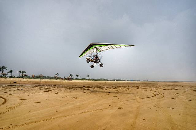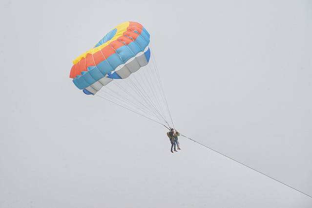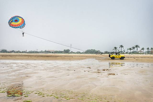 在三亚坐过快艇拉着在海面上翱翔的拖拽伞,非常爽,尤其是拉起来升空的一瞬间。这里的拖拽伞是在沙滩上拉着跑的,成本低了不少,好玩程度也有所下降,但对于没坐过的人来说,也是很不错的体验。