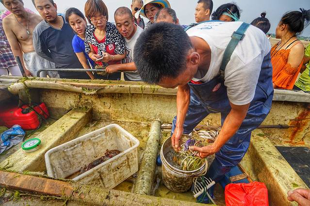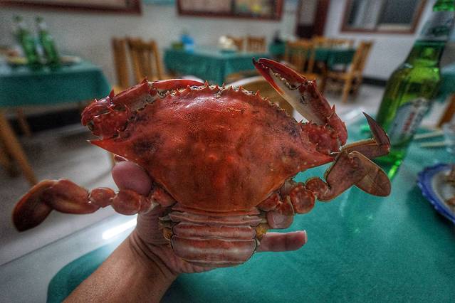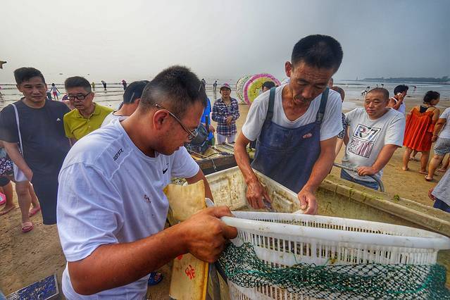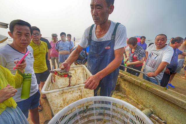 其实很多渔民都和商贩有合作的,每趟渔船回来,都会有商贩的车过来收货,游客又喜欢挑挑拣拣,所以很多渔民都不是很愿意把捕捞回来的海货卖给游客。不过有张哥在,还是帮我们和其他客人挑了几只螃蟹,毕竟这是眼看着真正从海里捕捞回来的活螃蟹,那感觉还是不一样的。