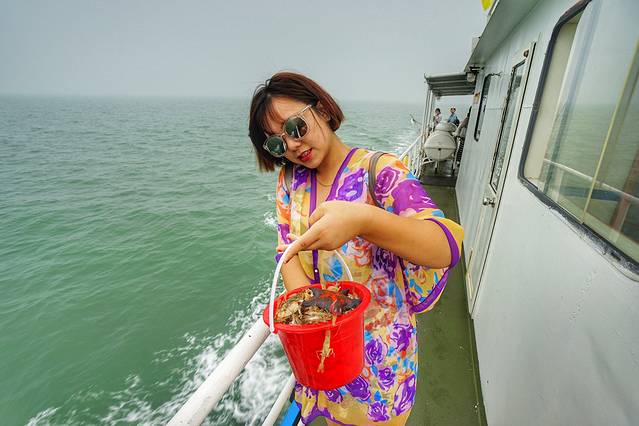 出海捕鱼的可不是真正的渔船,而是这种观光性质的游轮,真正的渔船是禁止载客的,这种游轮只是体验一下出海打渔的过程。在码头买票100元,没有折扣,渔家老板能拿到半价,感觉又可以出海,又可以分点捕捞上来的海鲜,倒也挺合算的。
