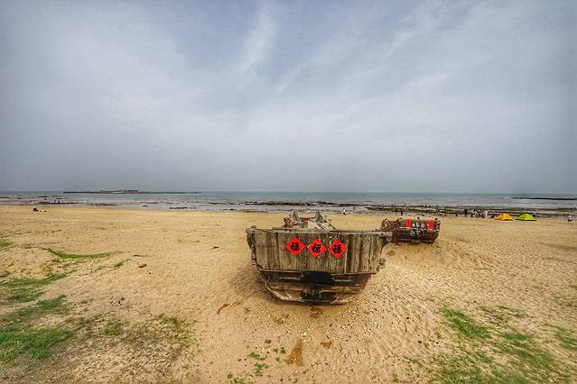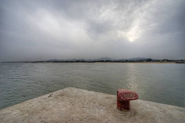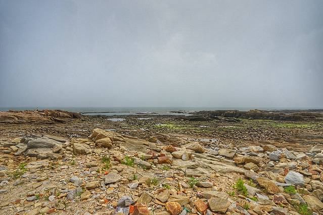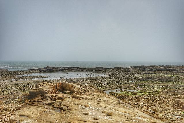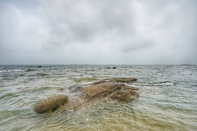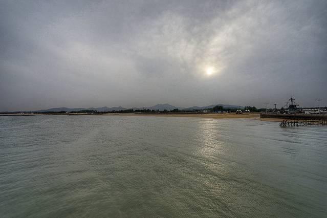 太公岛其实是很漂亮的,这里是个礁石岛,退潮的时候才会完全浮出水面, 不过现在是涨潮,所以完全看不到有个岛,只有水面上隐隐约约露出来一个救生塔。现在是考眼力的时间,大家看得见那个救生塔吗?