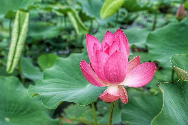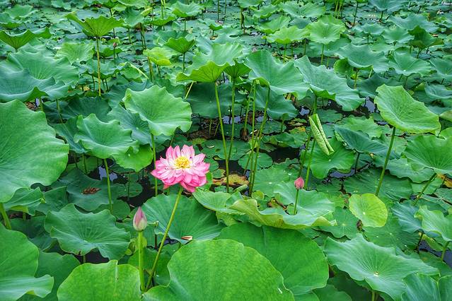 其实没有全开也挺好,反正现在荷花已经成了摄影三大烂俗题材之首了,也拍不出什么新意。反而这满池荷叶只有一支独秀或寥寥几支,显得更加独特一些。