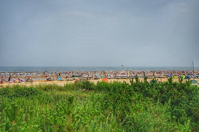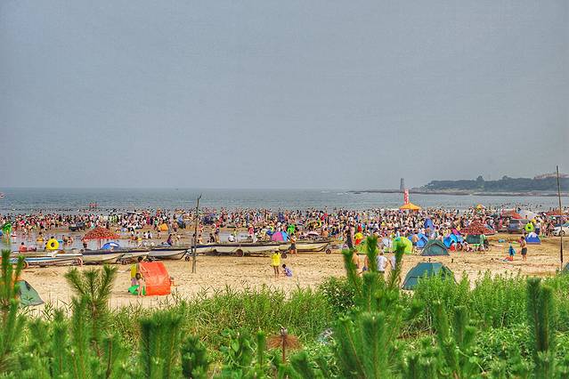 顺着森林公园的海滨往南走到头,有围墙拦着,隔着郁郁葱葱的植被,外面就是免费的吴家台浴场了,因为免费,所以这里是一派热闹喧嚣的景象,和森林公园里面的浴场还是区别很大的。