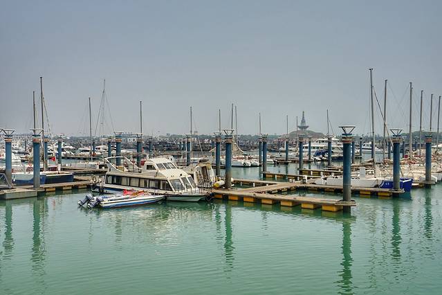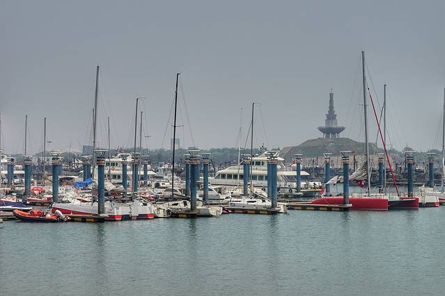 世帆赛基地所在的这片水域,就是万平口的泻湖,这里风平浪静,所以是船舶停靠的港湾。港池面积40万平方,分为浅水区、深水区、特深水区。主要设施有浮动码头6条,停船泊位320个,整整齐齐停放着各种大小游艇、帆船。对面万平口的潮汐塔遥遥在望,也算是很独特、很漂亮的景色。