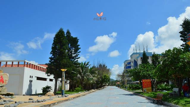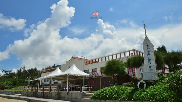 路过飞沙滩旁边的一间烧烤吧,不知道它晚上是否营业,这栋小房子的风格很讨喜,所以把它收录在了我的镜头里,帆船式的招牌,白色的方形遮阳伞,还有它的屋顶上,漂了好多棉花糖。