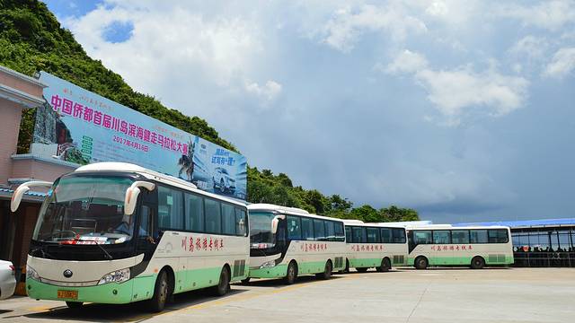 在独湾港,有个大大的停车场,停了好多的旅游大巴,因为啊下川岛是一个热门的旅游景点,假期游客特别多,所以旅游巴士也很多,十块钱车票,带我们去到王府洲景区,车程约15分钟,大巴满人就走