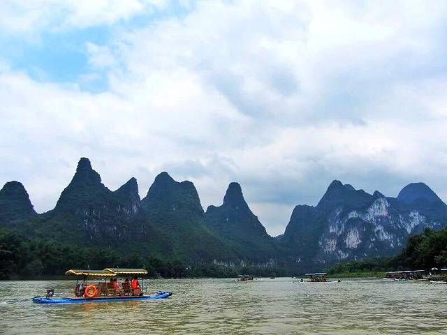 早上起得很早,先和同伴出去吃了个早餐,依旧吃的是桂林米粉外加一碗豆浆,相比第一次吃的,这家味道更地道些,饭饱食足后,原路返回准备坐车去杨堤然后乘竹筏去兴坪, 乘竹筏的主要目的也就是为了看桂林山水,因为这一段路的风景已经算是美不胜收了,所谓的“桂林山水甲天下,阳朔山水甲桂林”说的便是这里的风景,我们当然不能错过这一段路程。下图为我们乘坐的竹筏号,中间还发生了些小插曲。