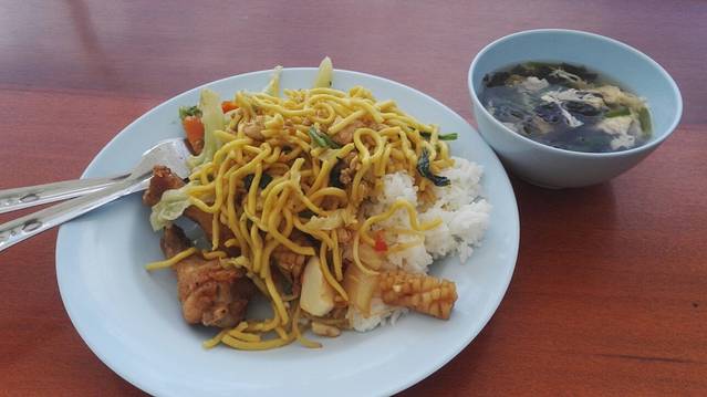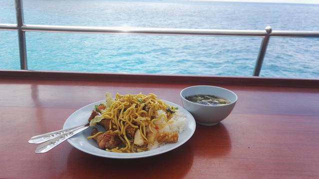 中午在船上用餐。看着海景,太美了!饭+面+鸡腿+蔬菜+汤+水果(菠萝和西瓜)。全程都可以喝船上提供的可乐,雪碧和矿泉水~