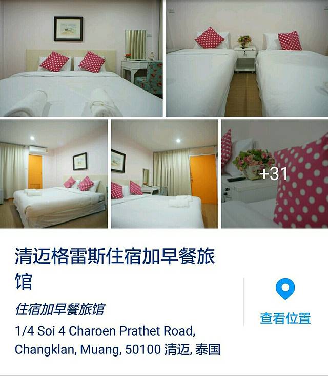 The grace house(格雷)在网上订的,两人间3晚1200THB=241RMB。离清迈国际机场不远,地图上显示4公里左右,打车10多分钟就能到。我们在机场里面找的出租,固定价格两人到市区150THB。要是用Grab肯定一半价格就够了,然而我们的手机很不给力,时不时不能用……