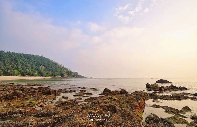 冠岭海滩面朝西面,是沿海的山凹进去的一片沙滩,水质很透彻,不过沙滩比较硬。远处的礁石可以走过去,不过我们时间不多就没过去了