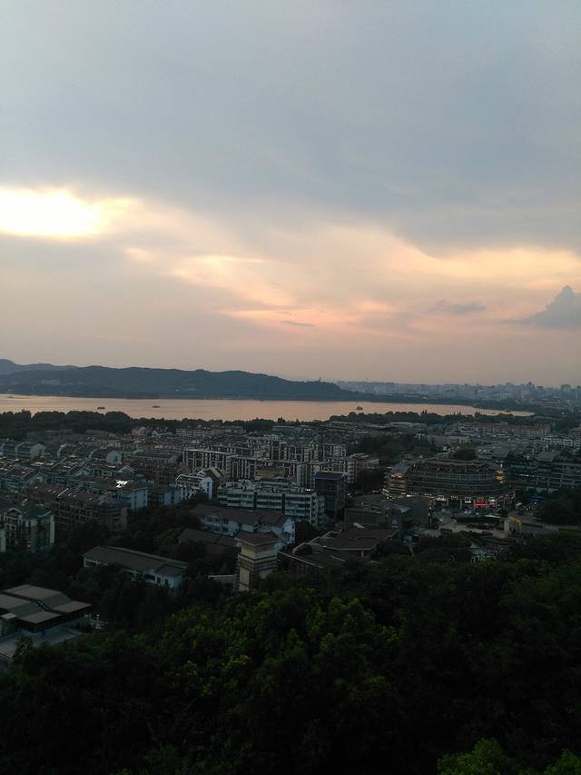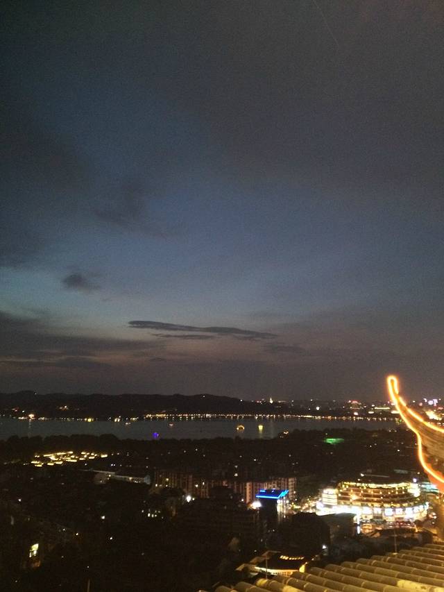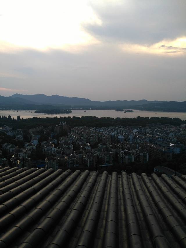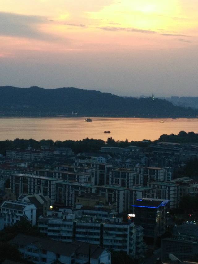 走完河坊街,正好是傍晚日落。于是果断上了吴山,准备去城隍阁看日落。然而天公并不作美,西边被一块沉甸甸的乌云所笼罩,我在城隍阁上等了良久,都未见到日落。于是兴味全无,下了城隍阁,走了不久,往西边瞥了一眼,只见一条红带划破了西空,宛如油画一般!于是赶紧跑回城隍阁,上了顶楼(还好我没出景区,否则又要重新买票),在楼顶呆了近两个小时,看了西湖的晚照,也看了西湖的夜景,真是不虚此行。由于我设备的缘故,感觉拍出的照片毁了那个美丽的景致。旁边有一个大叔用单反一直拍一直拍,真的很羡慕啊!
