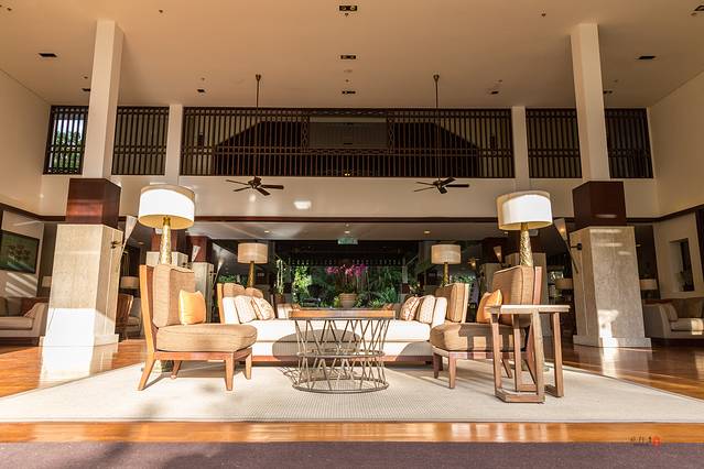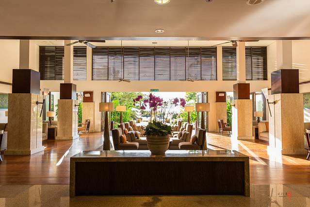 一种久违的神秘感使我仿佛来到了远古的古城,酒店散发着婆罗洲异国的风情,木质的沙发与木质的屋顶相得益彰,与大自然和谐共融,十分的接地气,迎门的花瓶里漂亮的天堂鸟由野菊花簇拥着,花香鸟语的喻意好美好,三角形的屋顶,房顶的房梁在立体交错中,任凭思绪飘飞,通透的回廊曲折在客房的门前,无论从任何一个角度都能够欣赏到完美的景色,绿树碧海间,一阵阵清新的气息拂面而来,闭上眼睛,快乐地尽情享受大自然的拥抱。脑海里一片空白,忘记了一切,只有安静的飘逸。因为通透的建筑艺术把所有的噪音都尘封于外界,告别了所有的喧嚣,只有内心世界问鼎超凡脱俗的美妙。