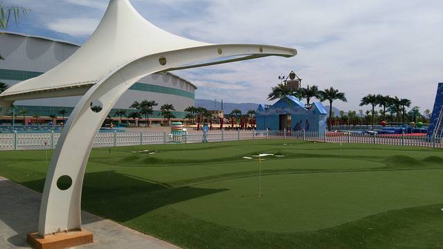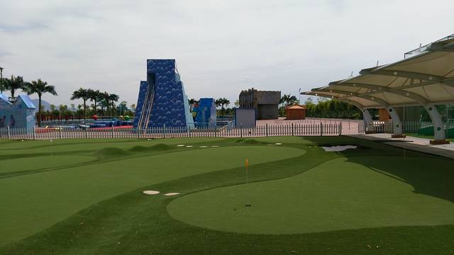 室外可以打迷你高尔夫,远处是“智勇冲关”,最刺激的是人造“海啸”,特别好玩!