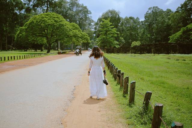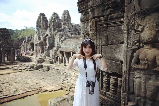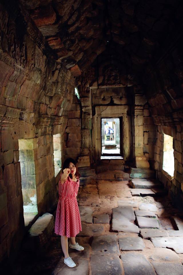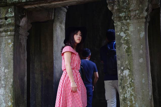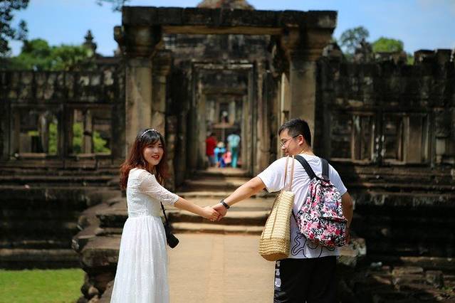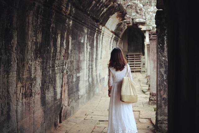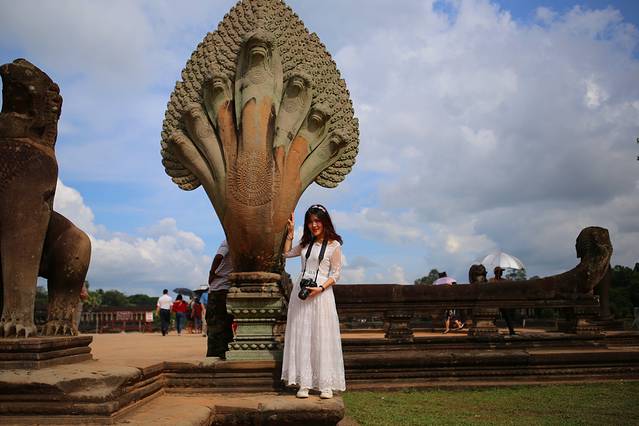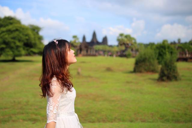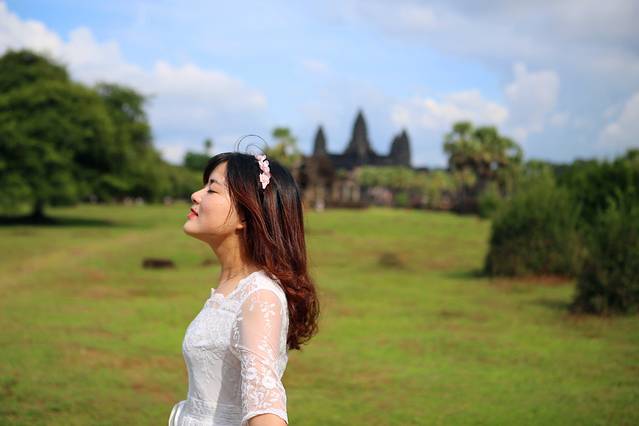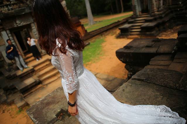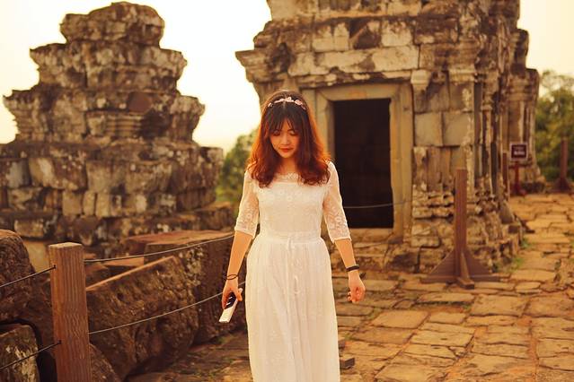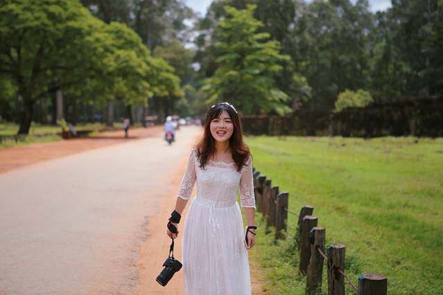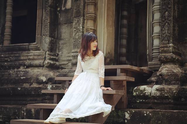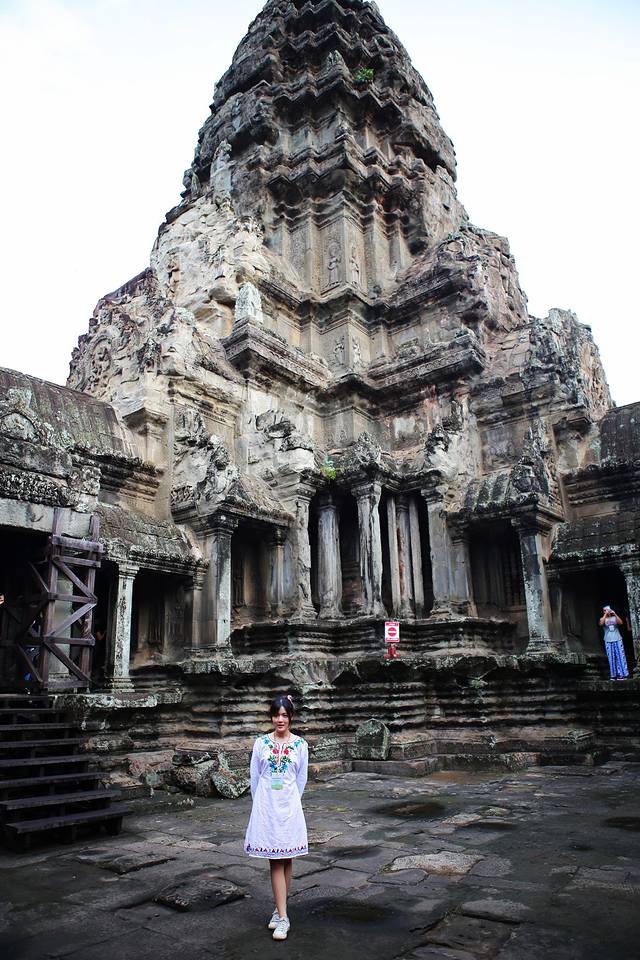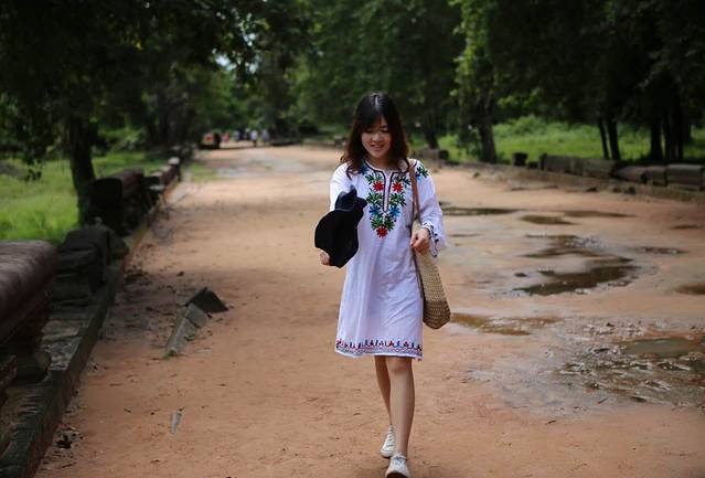 虽然赵小姐也不是什么摄影大师,但对于照片还是有些审美的。在吴哥整个灰灰旧旧的色调中想要突出人像,只能穿亮色系的衣服,赵小姐觉得被穿烂了,于是乎想换个白色的试一试,还真的不错。