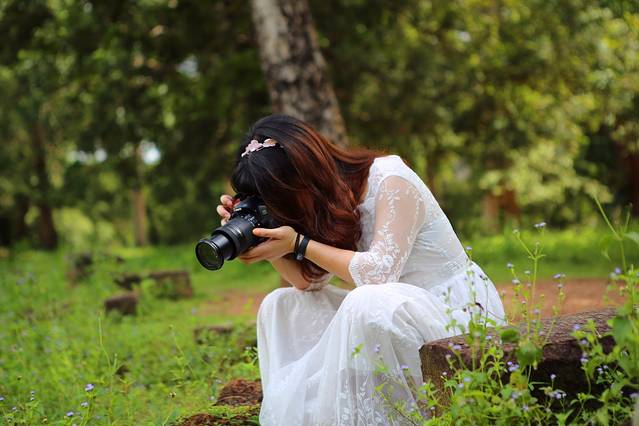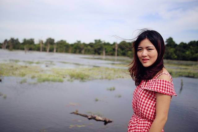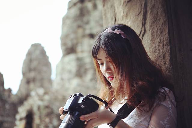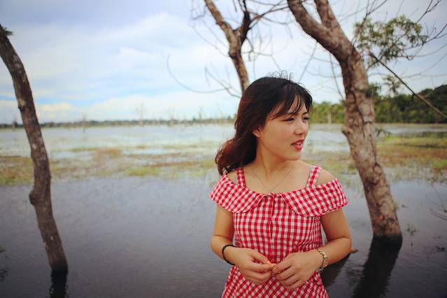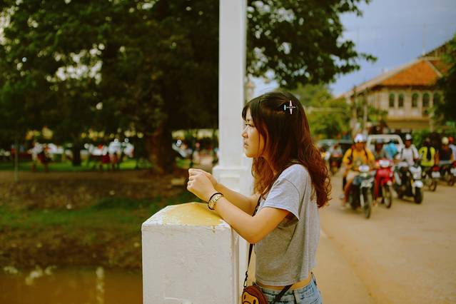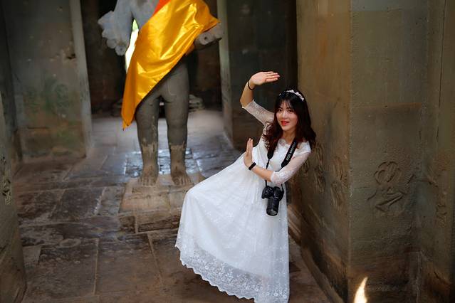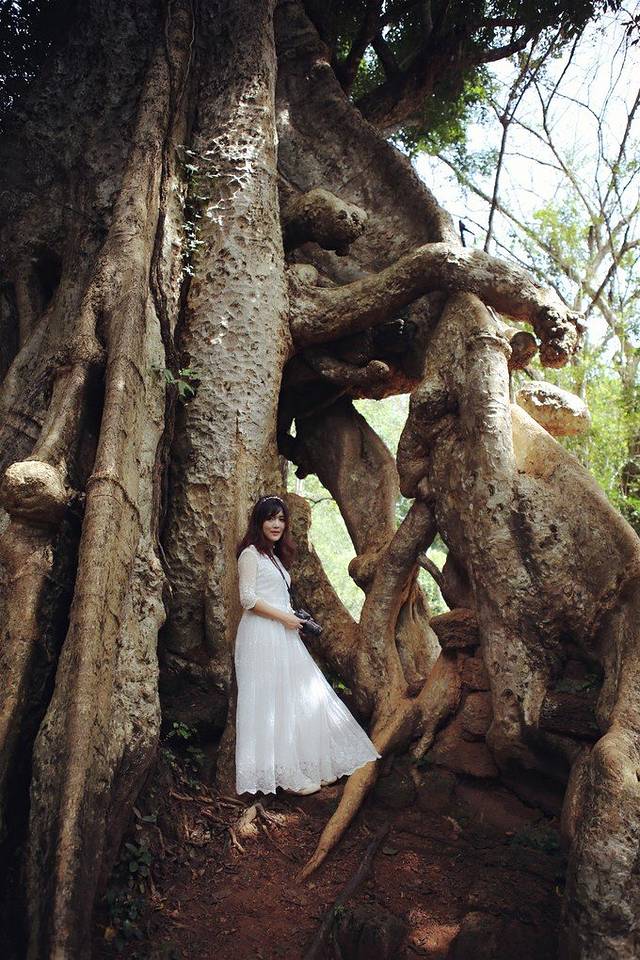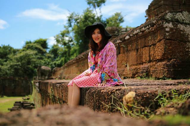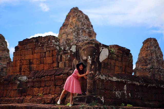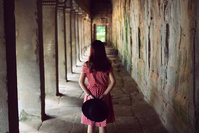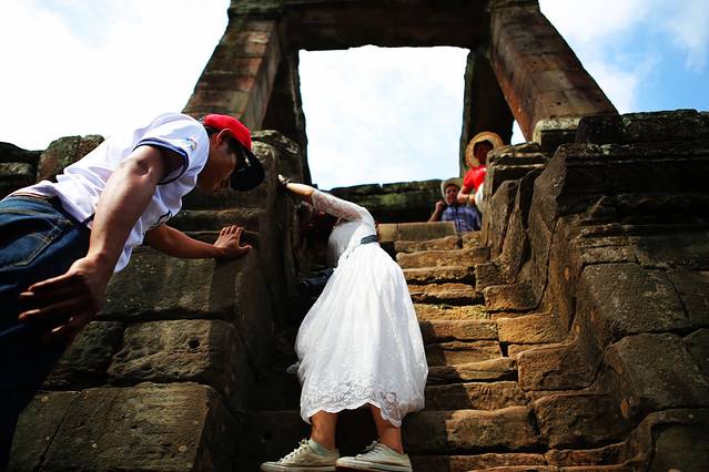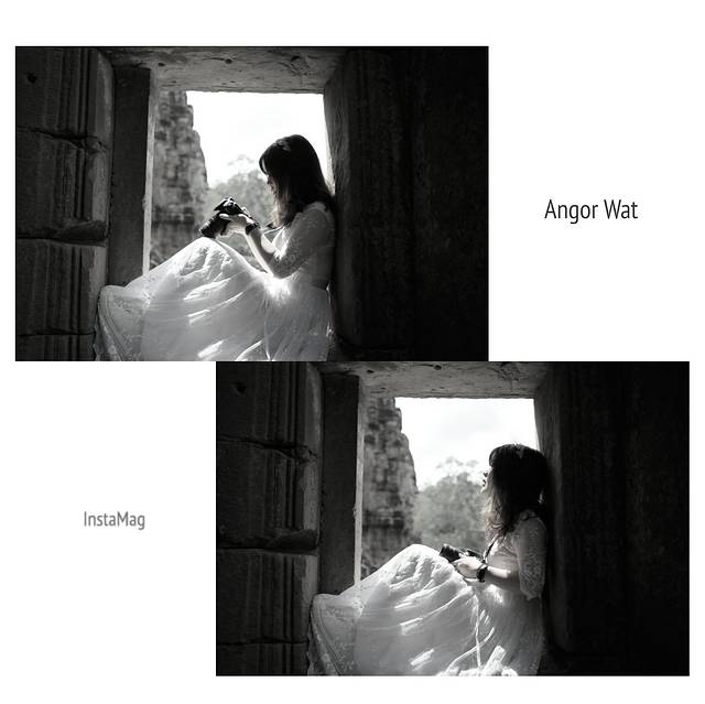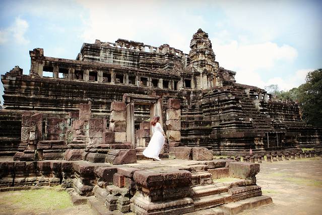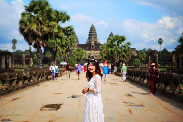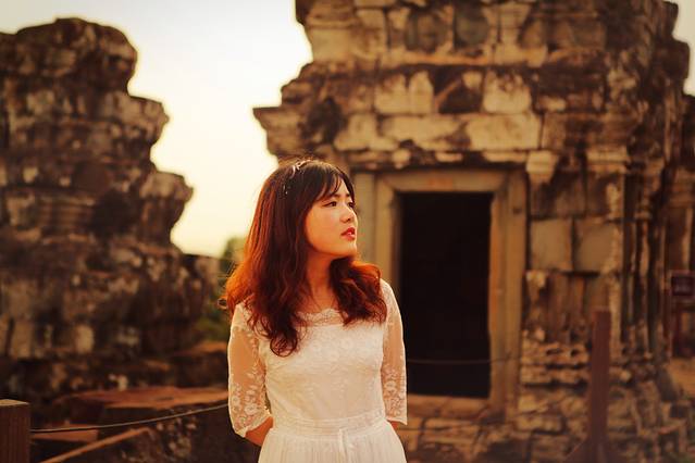 虽然赵小姐也不是什么摄影大师,但对于照片还是有些审美的。在吴哥整个灰灰旧旧的色调中想要突出人像,只能穿亮色系的衣服,赵小姐觉得被穿烂了,于是乎想换个白色的试一试,还真的不错。
