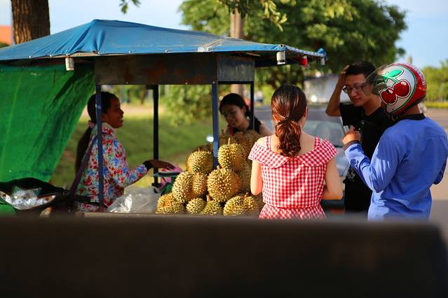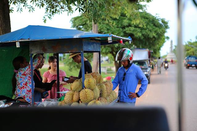 正巧,路边看到榴莲,其实榴莲也不便宜,5美金一公斤,007之前就告诉我们,现在这个时间,柬埔寨是没有什么水果的,所以红毛丹,榴莲我都很少看到,他说他们的榴莲还是进口泰国的。。。。不该啊!为什么热带地区的水果还要靠进口临近国家的啊!!!!