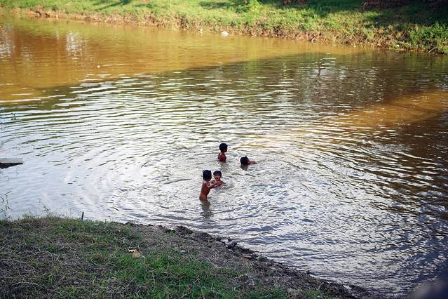孩子们就在这看起来脏脏的水里游泳,洗澡,但他们很快乐。