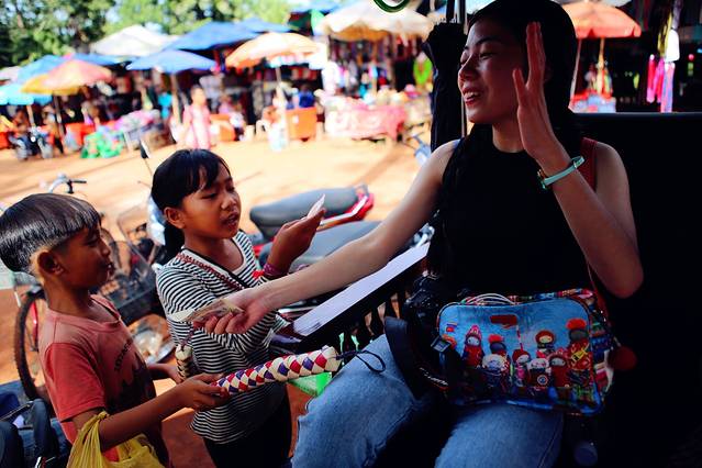 最后没有买这个小男孩的东西,他竟然说“No money, no honey, no baby”,一下我就震惊了。。。。。说实在的真的很不喜欢柬埔寨的这些小孩,是怎么样的环境造就了他们这样的形象,在东南亚从没看到过这样说话的孩子。。。。他们似乎已经失去了作为孩子的童真。。小悠说等我们的时候跟他们聊了会儿天,他们说他们读书的,不过是晚上七点到十一点。。。。难道这是因地制宜的表现么,为了白天能让孩子们在景区门口兜售他们篮子里的那些东西?