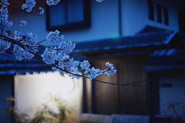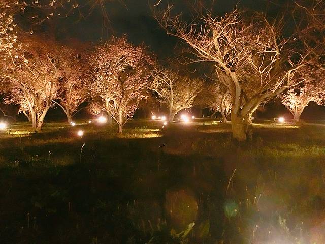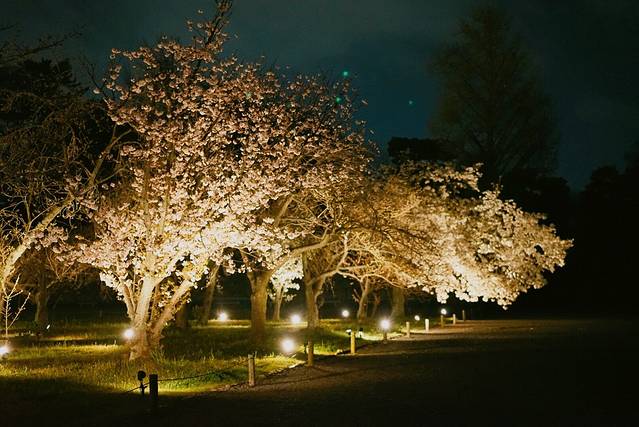 天气开始晴朗起来,变幻着的灯光映衬着满园盛开的樱花,明月当空,透过树梢,所谓花好月圆便是此时吧。