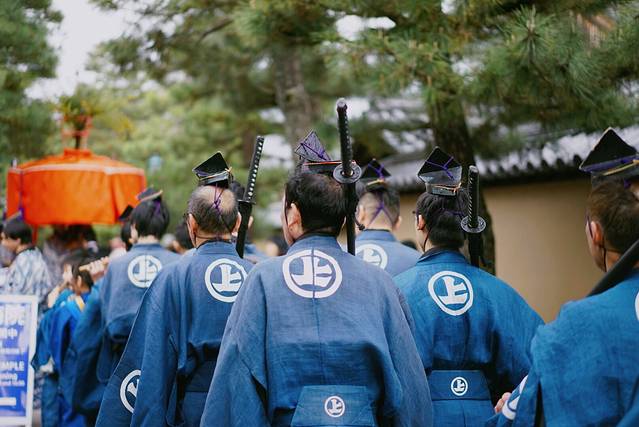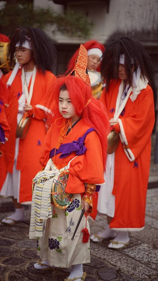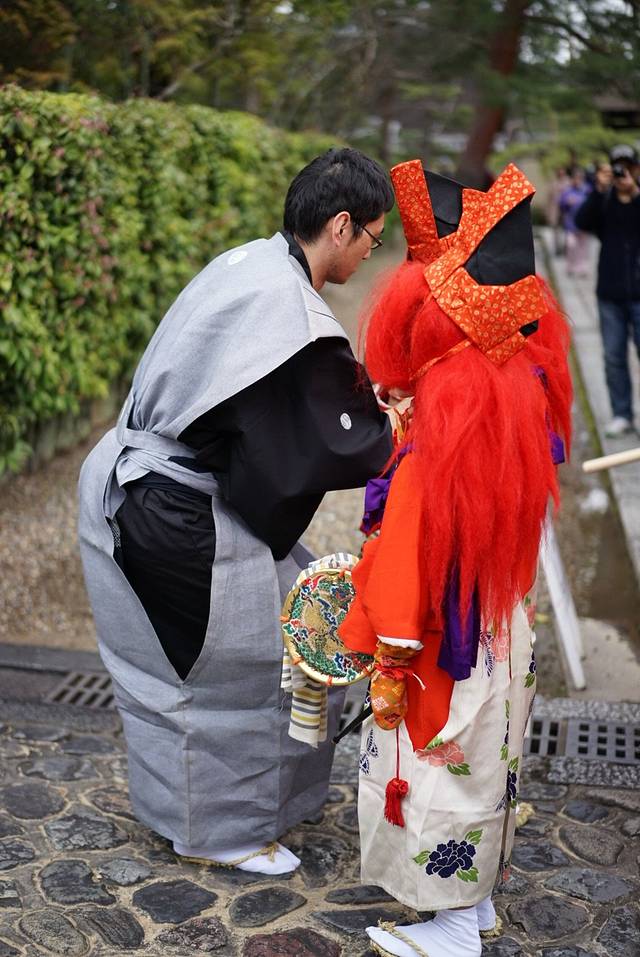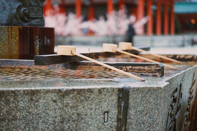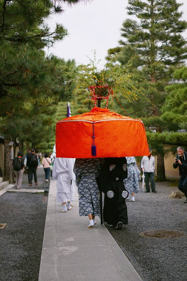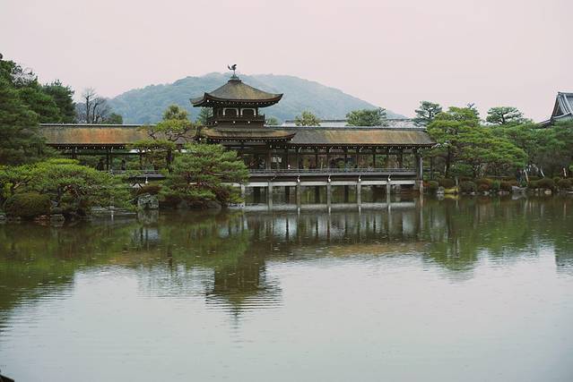 平安神宫有一个漂亮的大庭院,池塘亭台小桥,很有中国的韵味,当然最出名的是庭院里栽满的垂樱,参观神社时有一个家族在做祈福活动,传统的服饰,繁复的礼仪,由神官引领着,很是隆重。