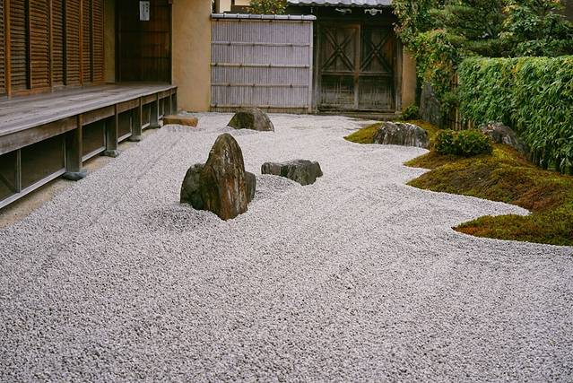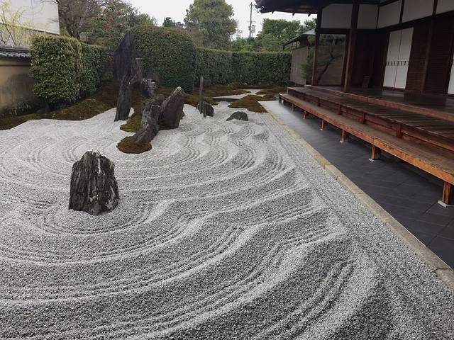在大仙院的日式茶室里,只有我与她相对而坐,吊在碳炉上的铁壶吱吱作响,按着日本茶道的步骤,老婆婆转动着茶碗递过一碗香茶,小盘子里一个小巧的茶点,她并不会说英语,也不会介绍什么,当然我也不会举起相机去破坏现在的气氛。大仙院方丈北庭和东庭与龙安寺的南庭齐名,是最具严格意义的枯山水。