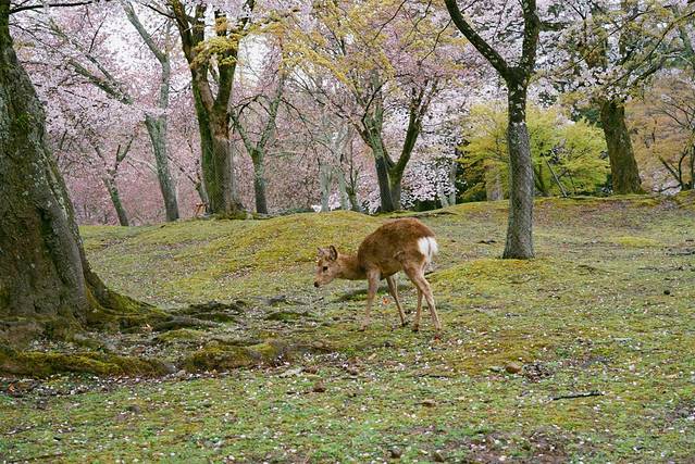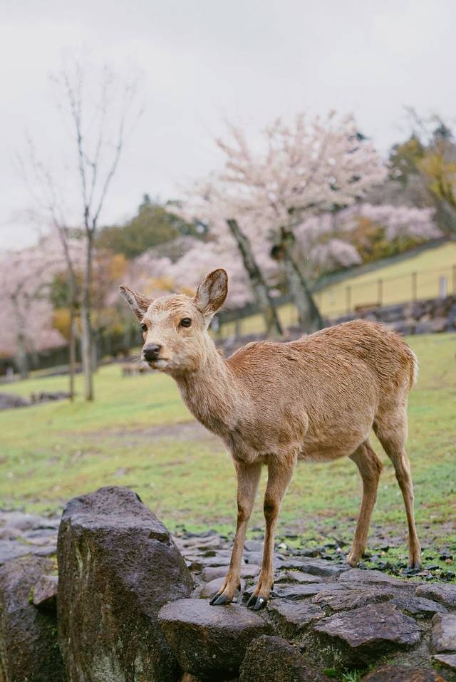 奈良公园里遍布着一千多头野生小鹿,它们早就看惯了人来人往,所以一点也不怕生,如果带着鹿仙贝的话,它们会毫不客气的围过来,吃完零食,它们又会毫不犹豫的走开,在这片领地里它们是绝对的主人。粉红的樱花树下可爱的小鹿,是这一季的奈良最美的画面。