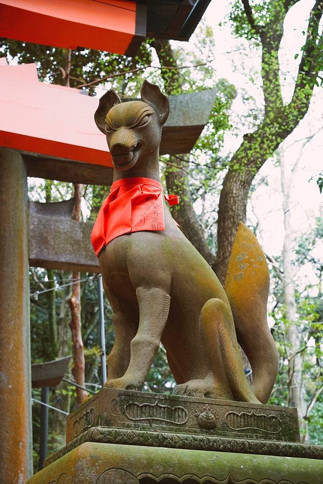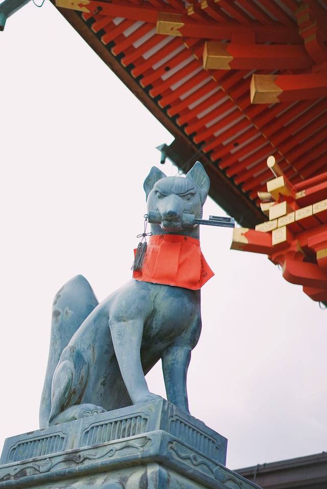 狐狸在这里被视为神明稻荷的使者,到处可以看到狐狸石像,嘴里咬着不同的法器