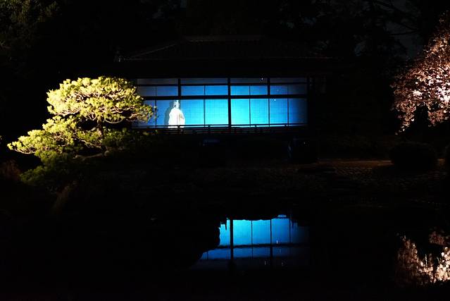 二条城的夜间参观,有两场激光表演,灯光变幻着打在二之丸御殿古老的院门上,青龙盘旋,仙鹤飞舞,最后化成樱花瓣飞舞,消失在夜色里,这是场声光电的奇幻表演。