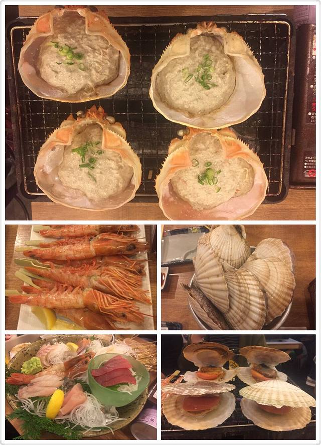 矶丸水产海鲜,这是一家海鲜烧烤店,店不大,座位也很局促,但是人气很旺,蟹味贝壳烧我觉得比蟹道乐的好吃,将蟹肉蟹黄连同芝士打成糊,算是这家店的招牌,印象深刻,24小时营业。