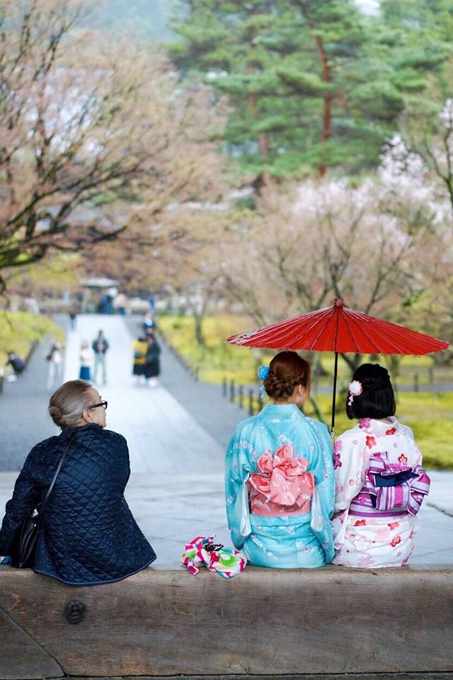 圆山公园里樱花盛放,不管你是黄皮肤还是白皮肤,都穿戴着和服走在这里,花树下设有茶席,团座于花下,喝茶聊天,就是这个春天最该做的事情。