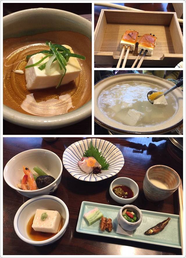 南禅寺下面有一个非常著名的豆腐料理店--顺正汤豆腐,汤豆腐起源于寺院精进料理,后来普及到民间,京都东山的水呈弱碱性,非常适合做豆腐,而这家寺院下面的豆腐店有着雅致的日式庭院,一种食材幻化出好多做法,每样小小一点点,却能足够的饱。
