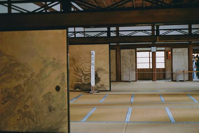 二条城中最著名的参观地--二之丸殿,分为六个隔间,明艳的金箔和深色的木质相应,梁柱间精美的雕刻,平顶镶板装饰的天花板,串联隔间的纸门画,尤其是殿内墙壁隔门上狩野一派的画作,画上镀着金箔灿灿发光,象征着将军的权势和富贵。殿内的走廊称为“夜莺地板”是幕府将军为了防范刺客,它能够在轻微踩踏的情况下发出吱吱嘎嘎的声音来警告有人入侵,这也算是参观的一种体验吧。