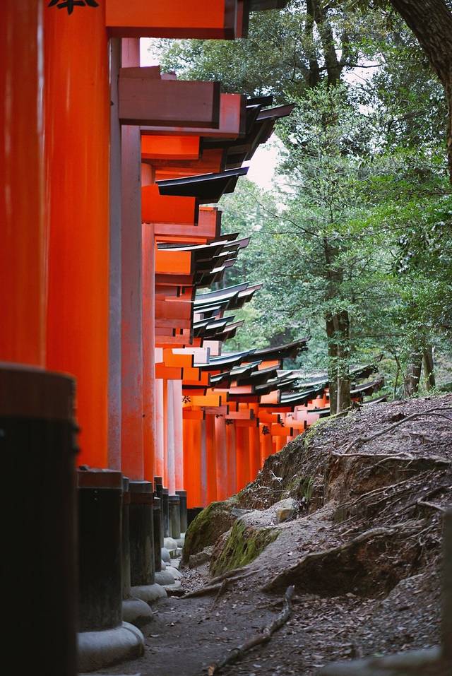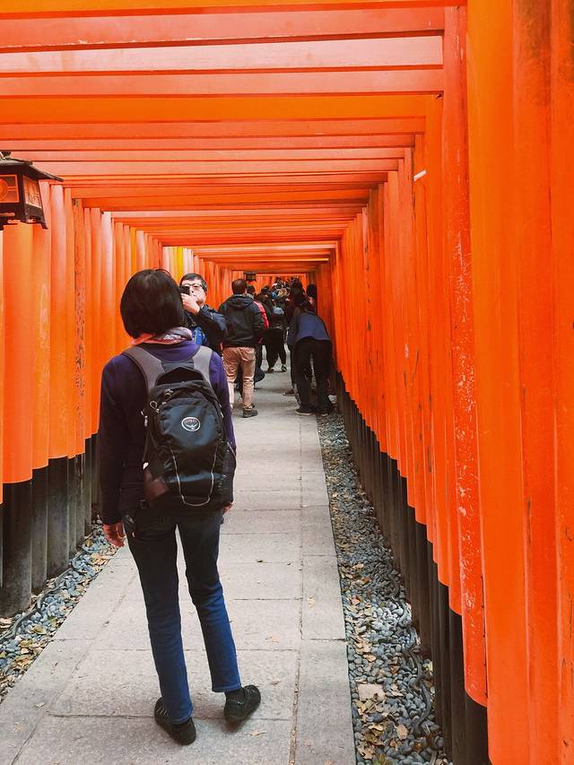 成千上百座朱红的鸟居构成一条通往稻荷山山顶的通道,曾在艺妓回忆录里看小百合奔跑过的就是神社主殿后面密集的朱红色“千本鸟居”这是京都最具代表性的景观之一,只是游客太多,选一个清晨或傍晚来这里,穿过重重鸟居,老旧褪色的暗红牌坊和光鲜亮丽的朱红牌坊交织在一起,我想那才是这里最壮观的时刻