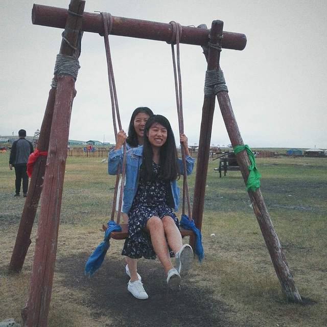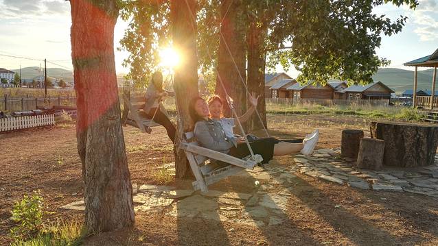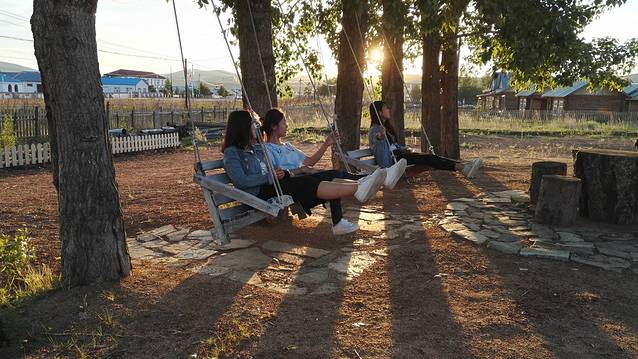 傍晚入住恩和,七点半阳光和煦,在住所的树下开心地荡起秋千。