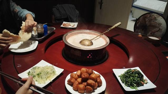 一切准备完后我们开始吃上了丰盛的早餐:香喷喷的奶茶,鸡蛋,果子(就是圆溜溜的那个),酸奶饼,凉拌土豆丝,花生菠菜……