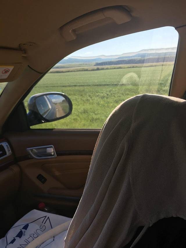 开车前往下一个地方,我们趁路还平坦,赶紧在车上化了个妆```