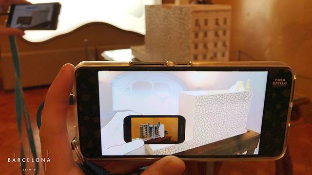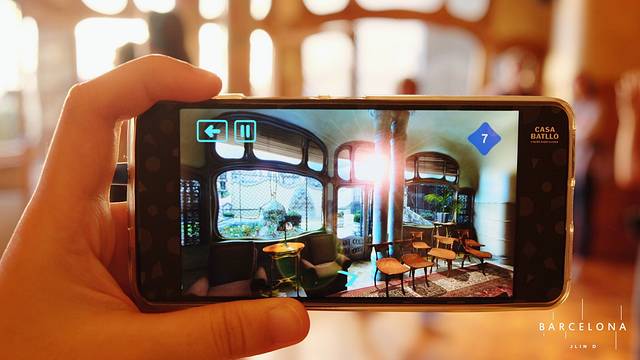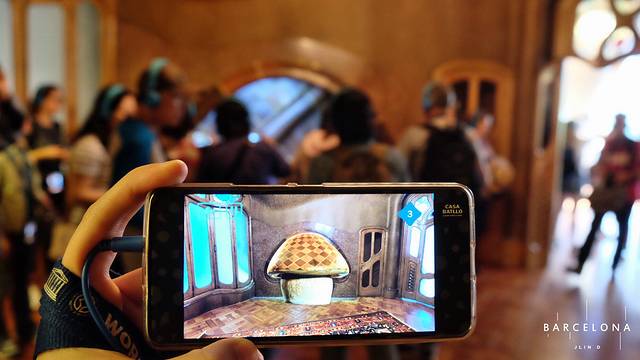 ▼诶呀,原来这个壁炉的原型是一颗蘑菇,在现实里看不到,但是用导览扫一下眼前的壁炉就会在画面中显示出以前高迪是怎么构思的,而且不怕人挤人看不见,因为导览里的画面是全部清场后的模拟画面...((●ˇ∀ˇ●)我特别喜欢这个创意,这样大家都不用挤一堆抢着拍照,游览体验还特别游刃有余)