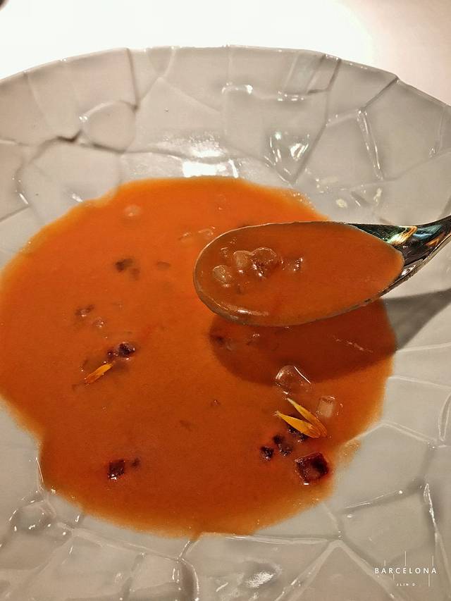 ▼这道就是..冰镇番茄汁里面加点三文鱼肉,洋葱碎末,胡萝卜碎末..