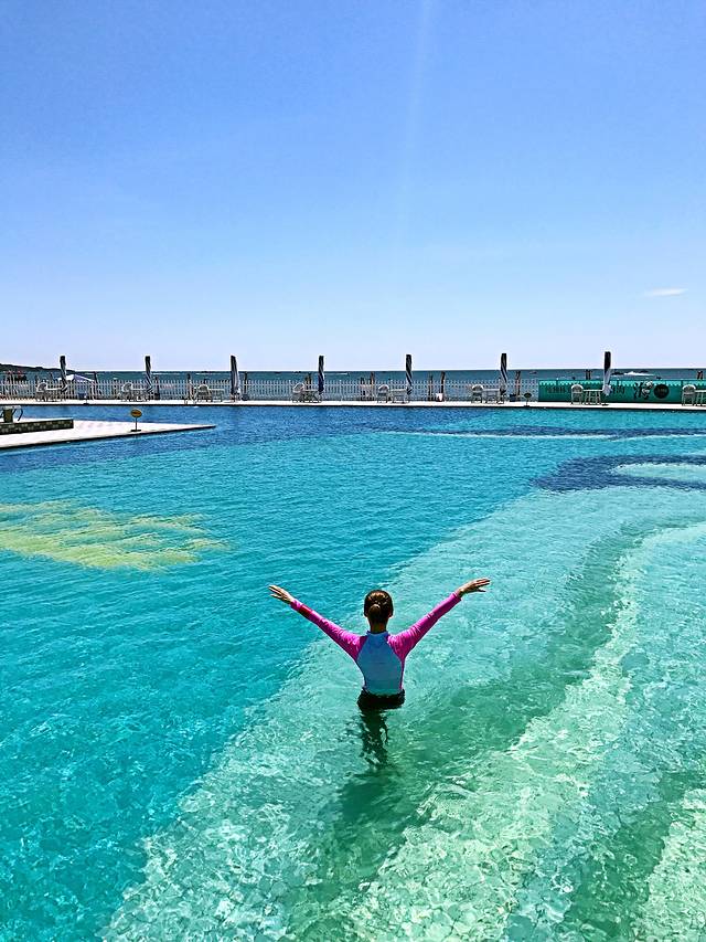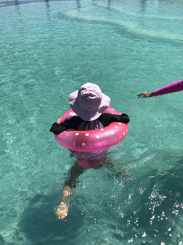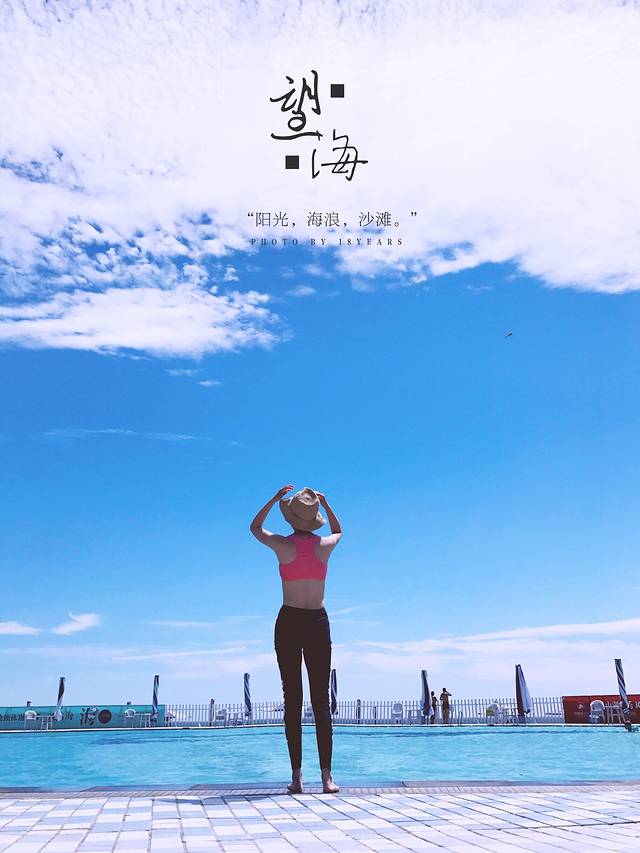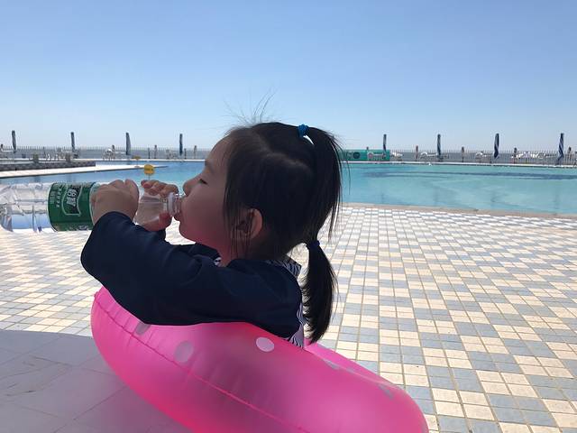 我们先去海边试了试海水的温度,真的很凉,不知8月是不是能好些,问了一下租个伞300元/天,我们又去了海水泳池,泳池里的深度0.9米-1.4米,虽然水有点凉但还是比海水好一点,成人38元/人,伞免费用,商量了一下还是泳池比较适合我家小妞,于是我们就在这儿玩了一天