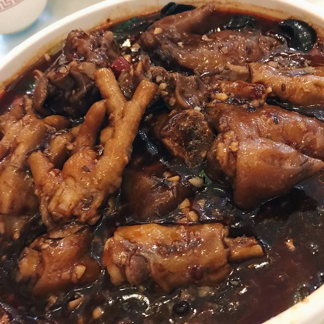 手牵手是鸡手和猪手做的已经脱骨了,下面是一些菜,感觉像是毛血旺的做法,有一点辣,但还是咸