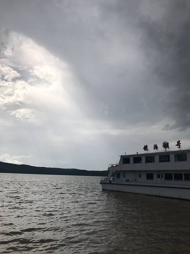 我头天晚上在火车站附近去找黑车,(包车600元,司机出高速费)!因为实在是受不了大巴车的热和脏了,决定包个车到镜泊湖!这个决定是对的,因为,大巴车也不能到镜泊湖门口,还要再打车!在离镜泊湖五六公里处就开始堵车了!由于下雨的原因,镜泊湖北门被淹,正常应该走北门的,我们又转到南门!镜泊湖是我们纠结的景点,因为网上都说没意思!大概是因为预期的不高,所以,我进去后,反而觉得很不错!镜泊湖进去后的观光车是坐一次花一次钱,一次一人12元!可能是下过雨的原因,吊水楼瀑布特别壮观,但因为水太大了,也就不允许走到瀑布前观赏了!镜泊湖很大,需要坐船游览,100元半圈!280元正圈,散客不让坐,说因为对岸得有人接应,也就是说,不给送回原处!我们没坐船,感觉没意思!孩子们也不想坐!索性省钱了!